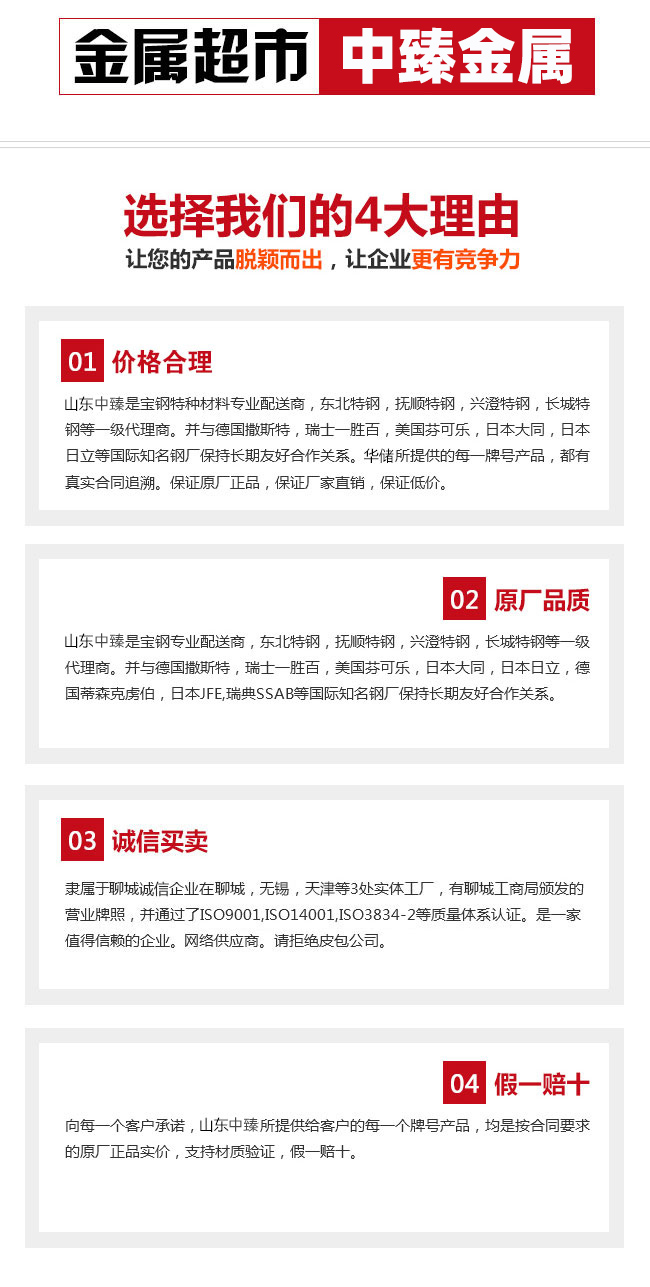 山東中臻是“優質鋼材一站式供應商”,山鋼集團,東北特鋼,撫順特鋼,長城特鋼,大冶特鋼等一級銷售商。中臻擁有聊城,無錫,天津三處實體工廠,常規備貨量達萬噸,規格齊全,每一所供牌號均有真實合同追溯。